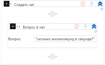 Чтобы поддержать диалог, добавьте в Создать чат элемент Вопрос в чат. Таким образом, Создать чат будет для него контейнером.