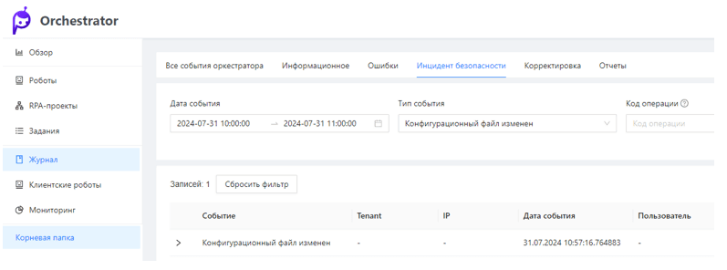 Службы Primo.Orchestrator (WebApi, RobotLogs, Agent, Analytic, RDP2, States, Notifications) проверяют целостность своих конфигурационных файлов при каждом запуске. Если с прошлого запуска файл изменился, то в Оркестраторе будет зафиксировано событие под названием «Конфигурационный файл изменен», относящееся к типу «Инцидент безопасности».